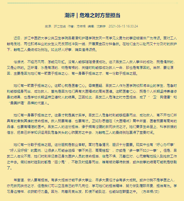 日前,公司公共卫生公司吕易津和护理公司武天一同学见义勇为的事迹被媒体广为传颂。为弘扬主旋律、传递正能量,宣传公司的育人成果,扩大公司的社会影响,践行党史学习教育目标要求,公司党总支书记方年根教授在浙江省委省政府新闻门户网站《浙江在线》发表评论文章《危难之时方显担当》。