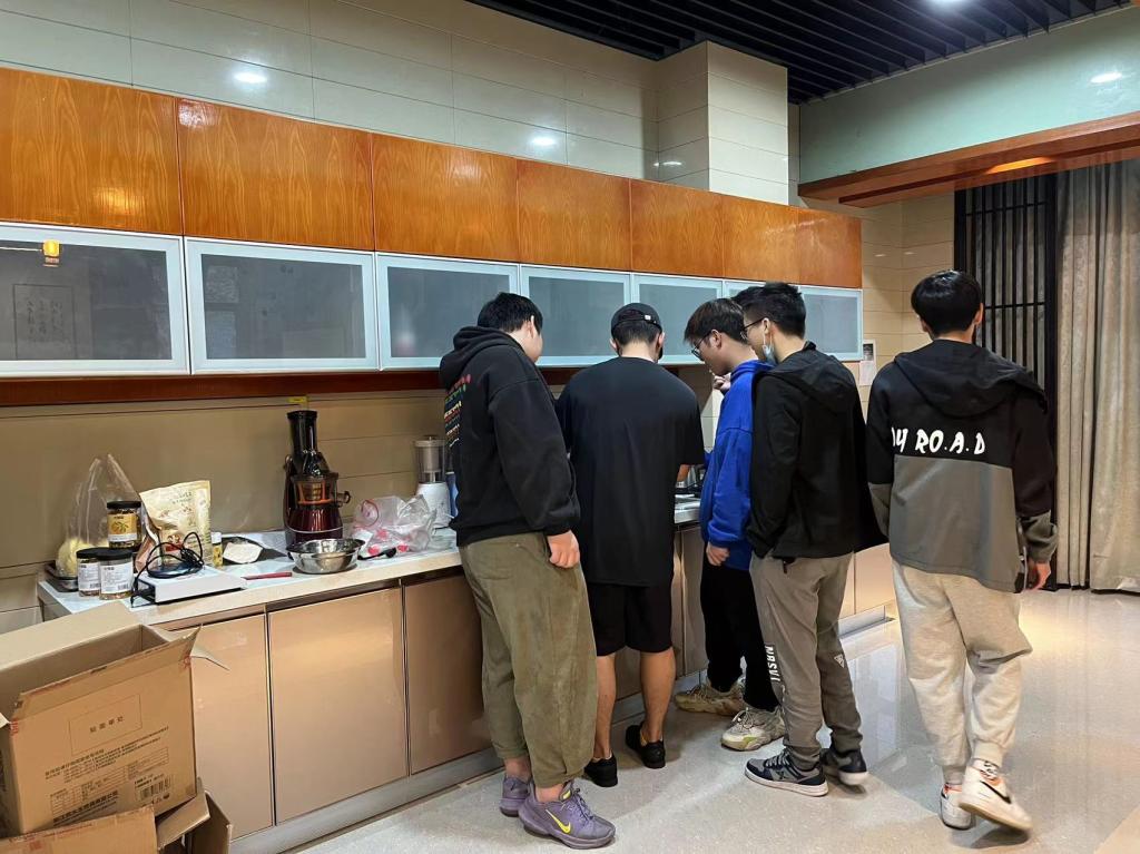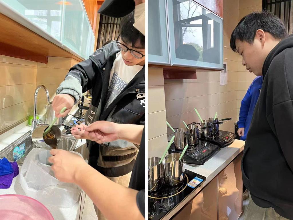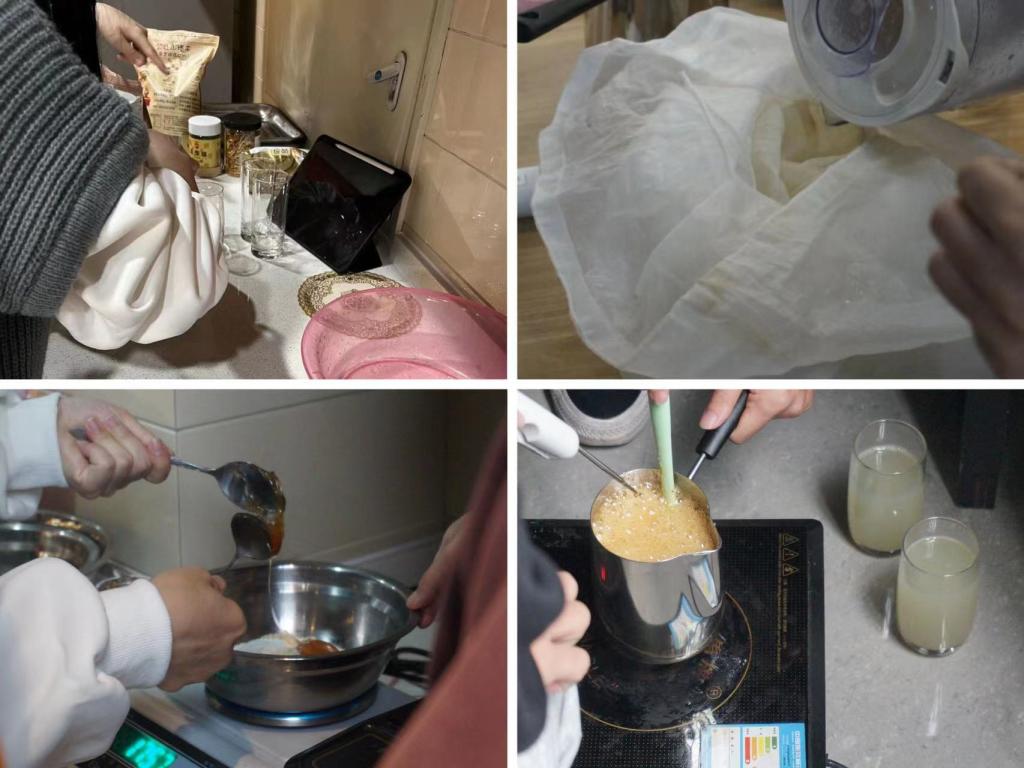 前期准备小组的同学们齐心协力摆放好制作所需的设备与原材料。按比例配置陈皮、山楂、罗汉果并煎煮,等候药材软化,药性全融于水,取出放凉滤去残渣后,保存为药膳汁,作为第二日之备用。