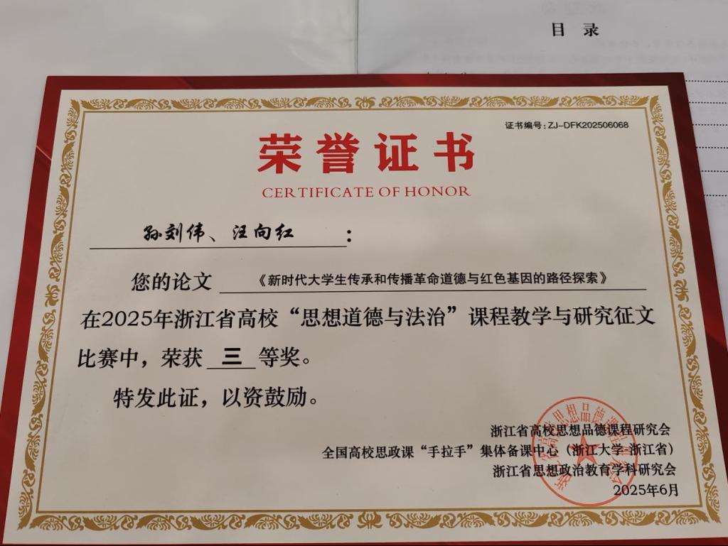 孙刘伟、汪向红老师荣获2025年浙江省高校“思想道德与法治”课程2025年度教学与研究征文比赛三等奖。