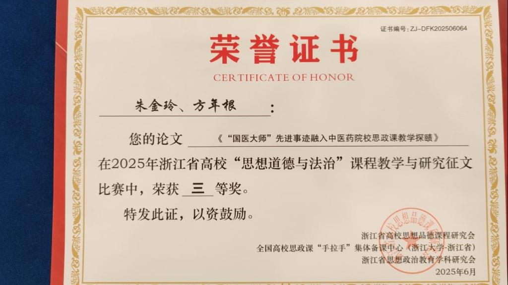 另外,朱金玲、方年根老师荣获2025年浙江省高校“思想道德与法治”课程2025年度教学与研究征文比赛三等奖。