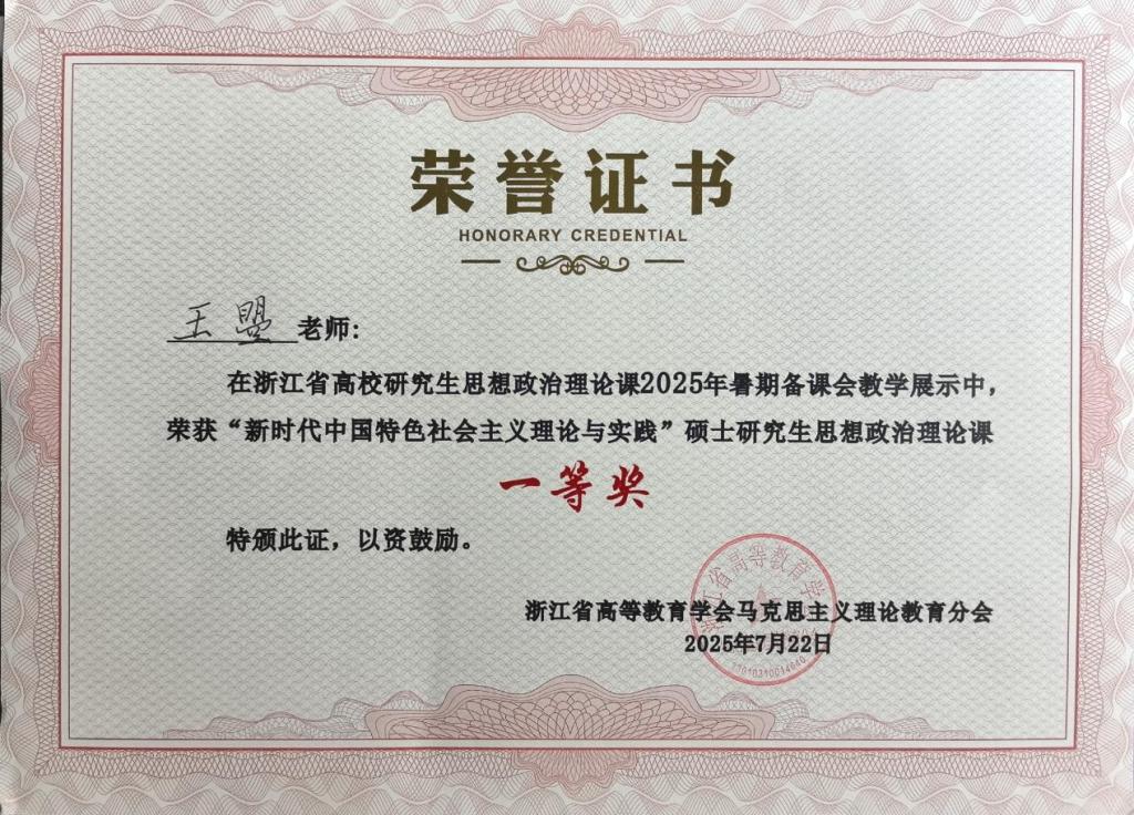 王曌老师荣获2025年浙江省高校研究生思想政治理论课“新时代中国特色社会主义理论与实践”暑期备课会教学比赛一等奖。