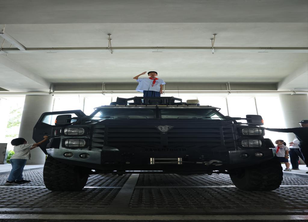 滨文小学305班员工连想则对警用装备念念不忘:“‘剑齿虎’太酷了!我还试穿了防爆服,虽然走两步就累了,但我觉得穿这身衣服的人特别了不起。”