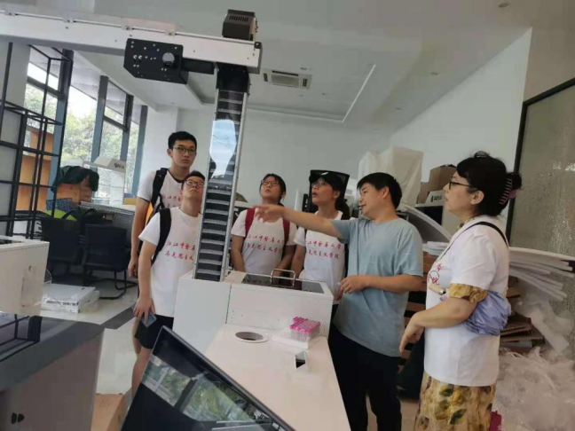 杭州世诺科技有限公司的技术人员还向我们详细介绍了全自动智能采血管理系统中的采血管智能贴标系统和采血管自动传输系统,亲自演示了自动化设备分拣采血管的工作过程。全自动智能采血管理系统改善了采血窗口环境,提高检验科智能化水平,即使是单机故障也不影响整条流水线的运作,操作简单,即装即用。其中的标本运输机器人标本运输机器人通过激光导航等技术,可以实现自主避障、自主巡航、自主充电、自主乘梯等功能,在医院实验室、耗材室、病房等场所实现无人全自动物流配送,安全便捷,节约医护时间,提高效率。小组成员们认真学习,仔细聆听,真切感受到了自动化流水线的便捷,体会到了科技发展改变人们的生活。