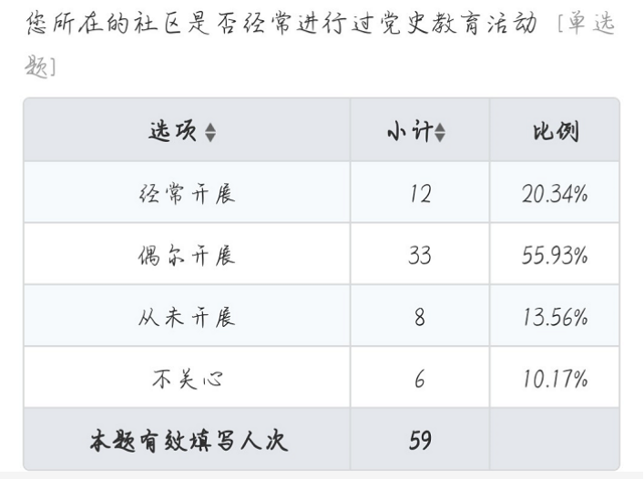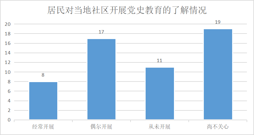 从调查结果上看,尽管大部分的居民还是会去了解或者听说涉及到社区党史教育的活动,但是当地仍然有一小部分的居民对党史学习教育漠不关心,且有接近1/3的社区从未开展过党史教育的活动。尽管社区有着较为丰富的党史学习教育活动,但由于宣传深度不足,形式不够新颖等问题,居民的参与度仍然较低。