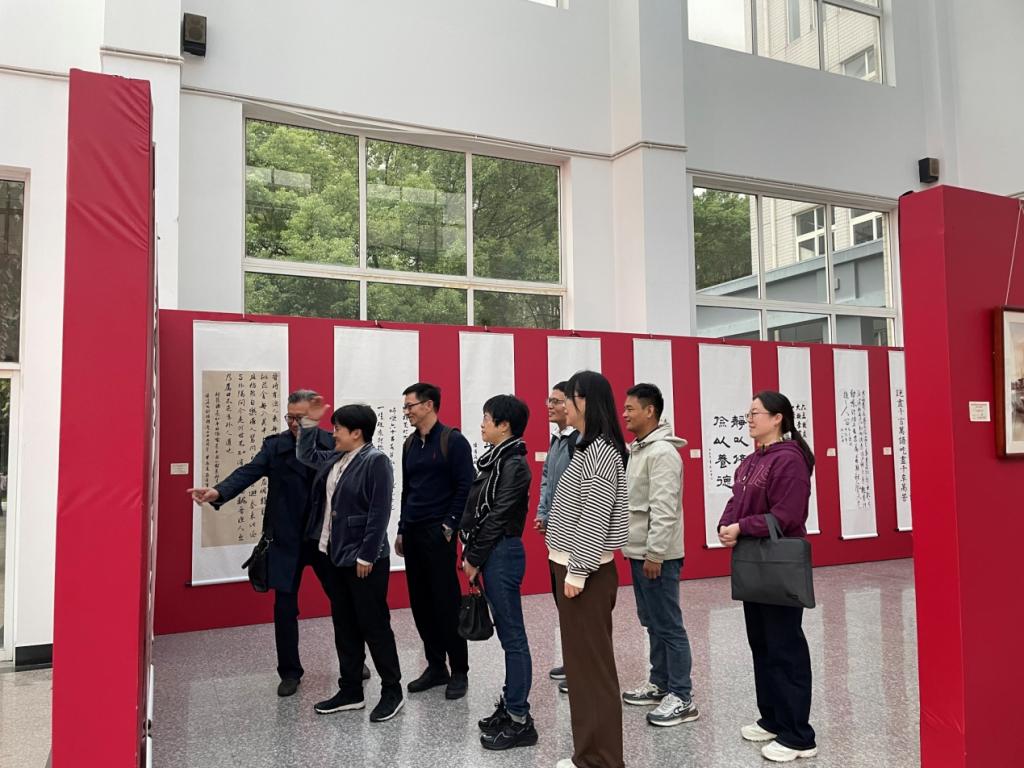 2024年10月30日,党支部成员在滨文校区图书馆一楼大厅观看太阳成集团tyc9728建校65周年书画展。